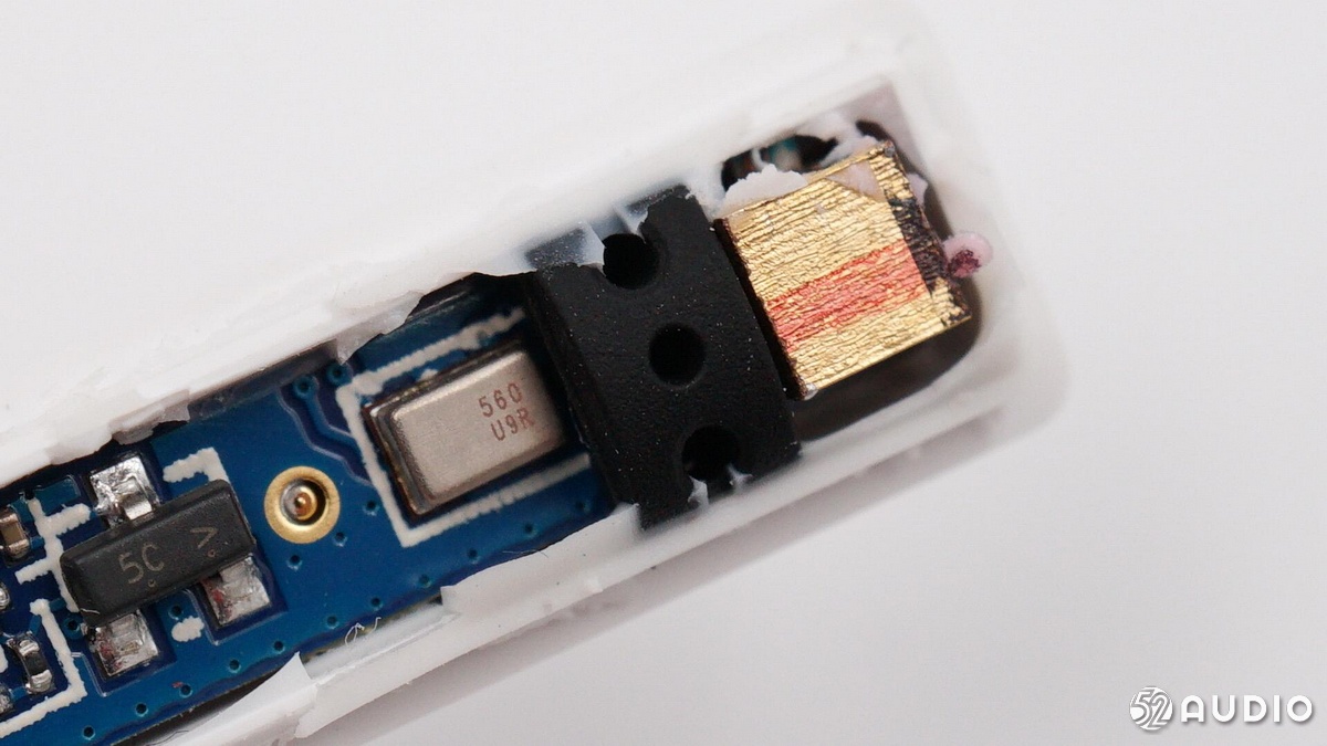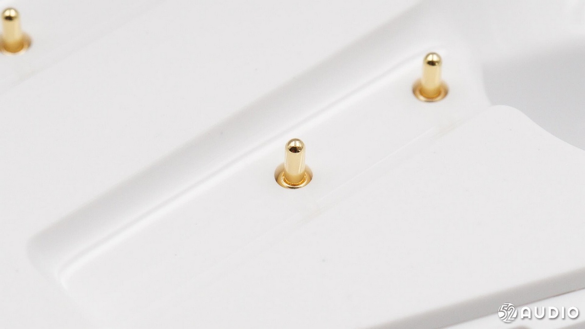 充電銅柱特寫。與充電盒的頂針接觸后,充電盒電池就會(huì)給耳機(jī)電池供電,銅柱上有密封圈,防止液體進(jìn)入。