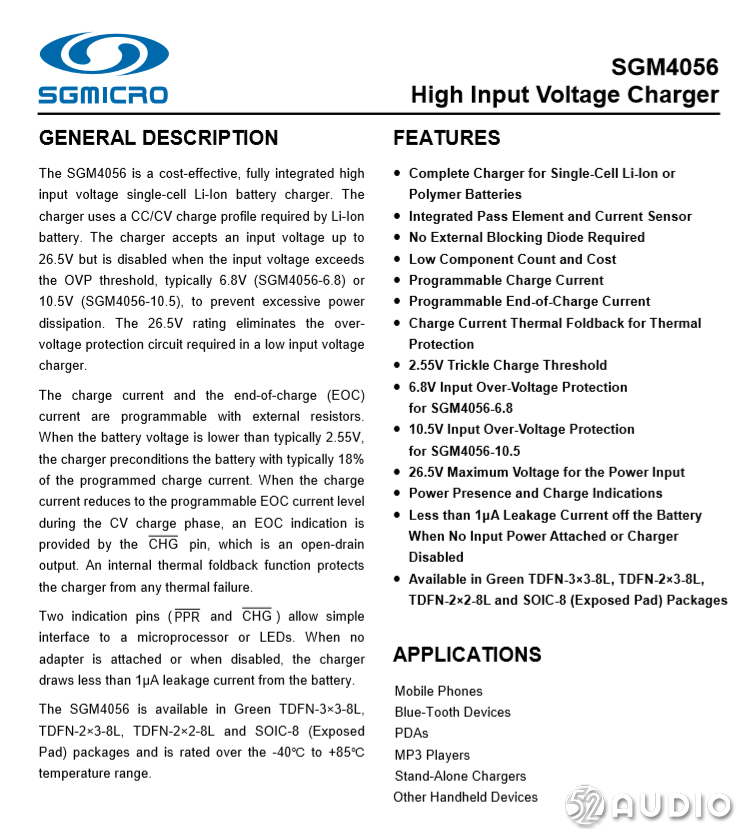 圣邦威SGM4056 線性充電IC,內(nèi)置過壓保護(hù),最高耐壓26.5V,并且有6.8V過壓保護(hù),可以省去外部過壓保護(hù)元件。