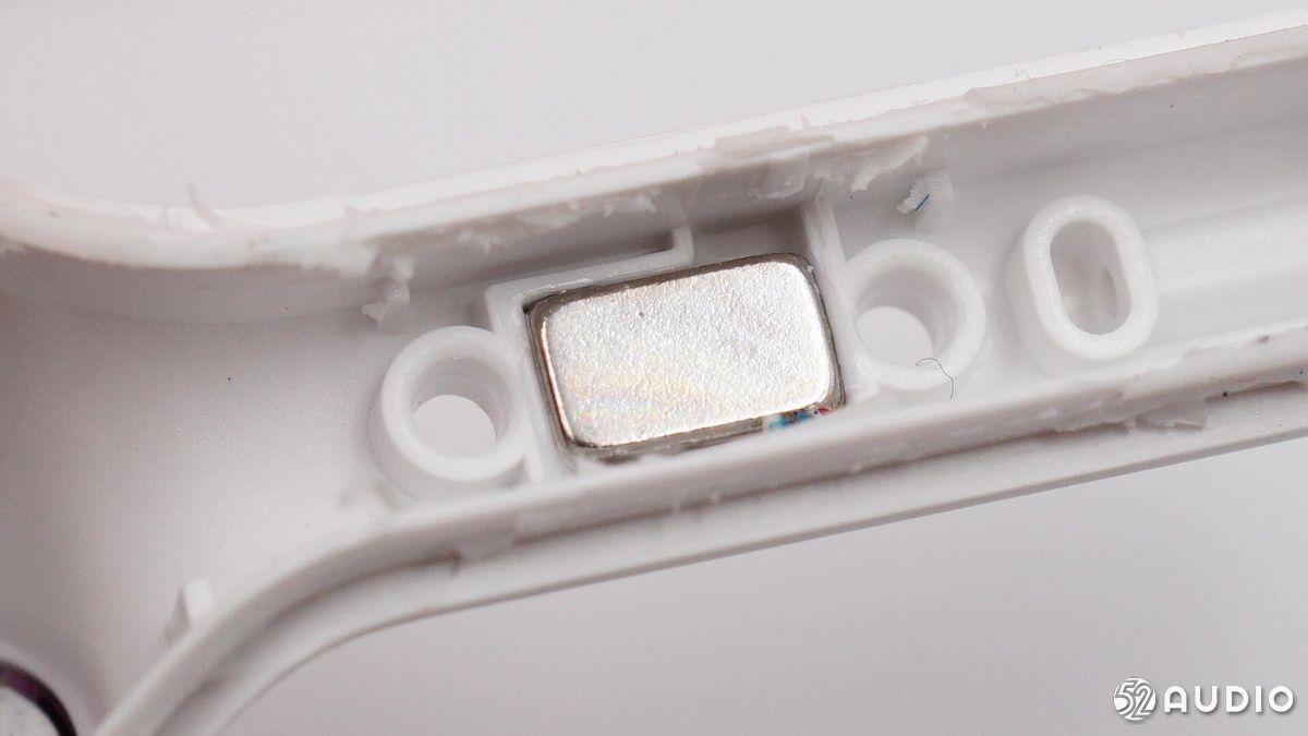 充電座艙內(nèi)側(cè)的三塊磁鐵,兩塊小的用于固定耳機(jī),一塊大的用于吸附充電盒蓋。