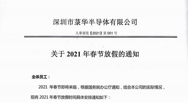 2021年春節(jié)即將來臨,根據(jù)國務(wù)院辦公廳通知,結(jié)合本公司的實際情況,我司2021年春節(jié)放假時間具體安排通知如下:2月7日至2月17日放假調(diào)休,共11天;2月18日(初七)正常上班。