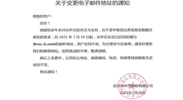尊敬的客戶:您好!感謝您多年來對光華芯的關(guān)注與支持,由于菉華集團業(yè)務(wù)發(fā)展及數(shù)據(jù)合規(guī)性的需求,自2021 年7 月16 日起,光華芯全員己啟用后綴為@csc-ic.com的郵件地址,用戶名則不變。為方便您今后使用,請及時更...